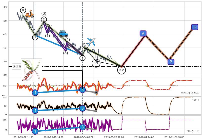 ➣ 1,3,5驱动浪MACD, RSI, KDJ走势都出现【常规背离】反转信号增强