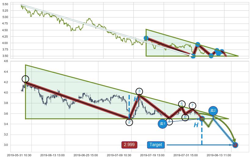 从2019-07-22 14:00至2019-07-31 15:00,共包含44个小时,阶段股价上涨2.64%,阶段股价变动位移路程比: 1 : 7