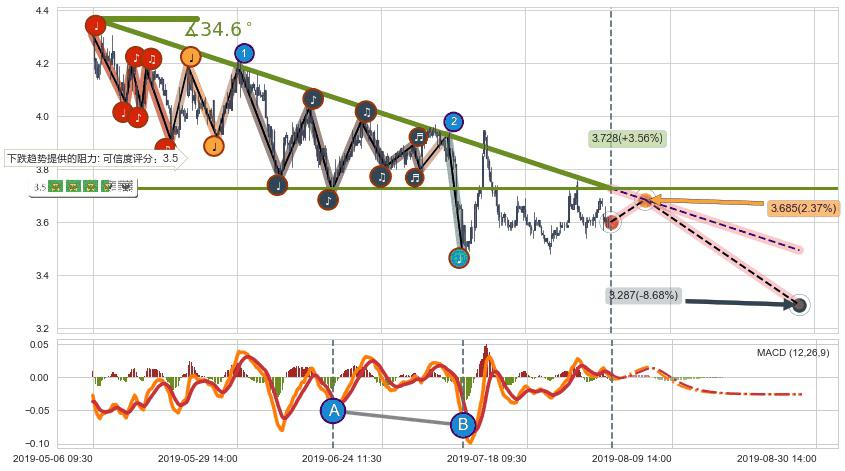 ➢ 预测:2019-08-06 15:00,【小幅反弹】稳定目前下跌趋势的前提下,预测价格:3.685