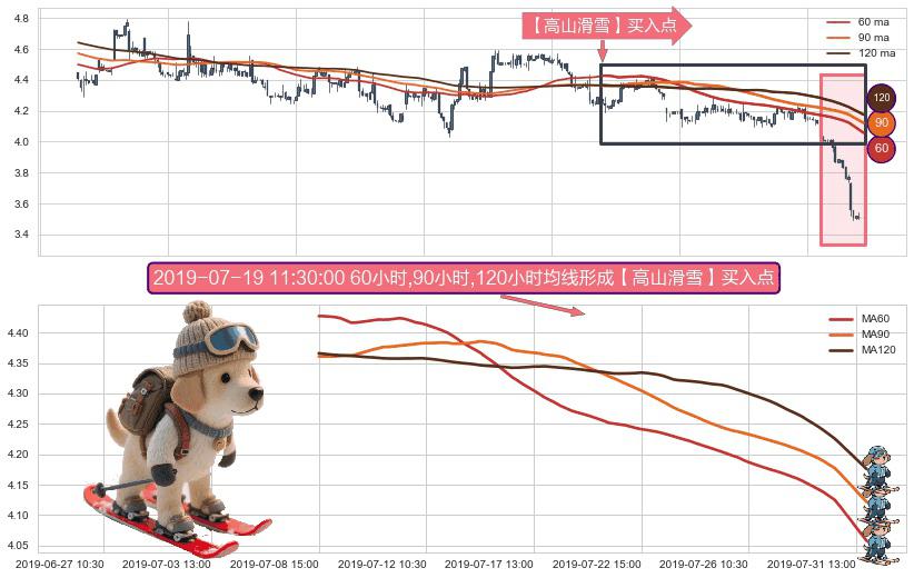 形态多维评估: ⚀ 2019-07-08 15:00:00小时-2019-07-31 15:00:00小时显现 60小时-90小时-120小时均线 【高山滑雪】买入点 看多信号,后市看涨,买入