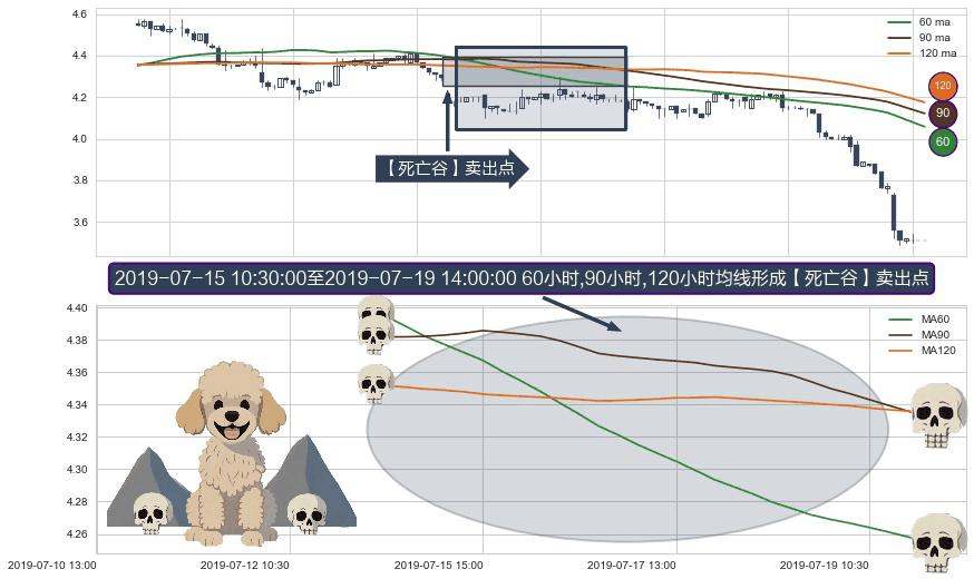形态多维评估: ⚀ 2019-07-15 11:30:00-小时至2019-07-19 14:00:00-小时显现 60小时-90小时-120小时均线 【死亡谷】卖出点 看空信号,后市看跌,卖出