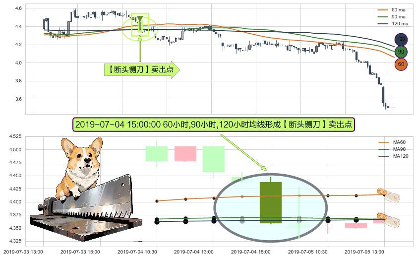 形态多维评估: ⚀ 2019-07-04 15:00:00小时显现 60小时-90小时-120小时均线 【断头铡刀】卖出点 看空信号,后市看跌,卖出