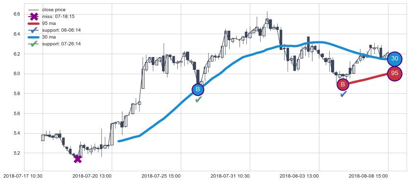 上涨趋势07-17 10:30-08-08 15:00,均线30, 95确认关键支撑2处