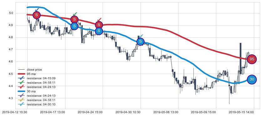 下跌趋势04-12 10:30-05-15 14:00,均线30, 95确认关键阻力4处