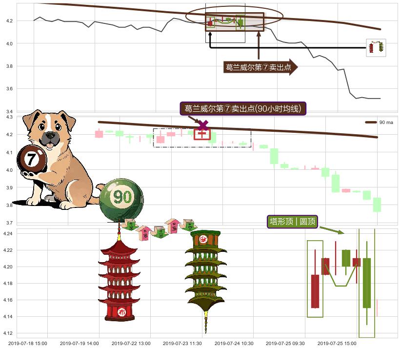 从2019-02-22 15:00至2019-07-31 15:00,共包含637个小时,阶段股价下跌-38.10%,阶段股价变动位移路程比: 1 : 10,下跌趋势角度: 30.8,2019-03-29 09:30向↘︎形成缺口,跳空下跌-13.67%˚