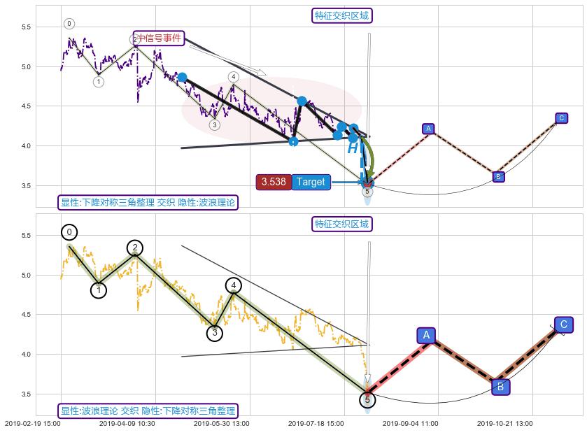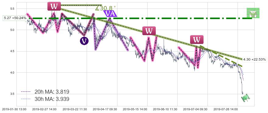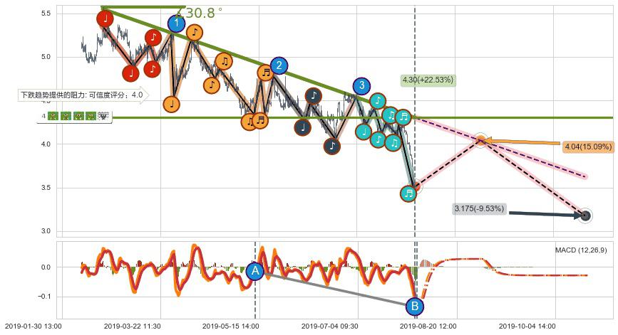 ♘ 在最后的下跌阶段2019-02-22 15:00至2019-07-31 15:00,存在 持续未破位的阻力位 ,阻力价格4.30,可信任强度86.00%,其距离最后价格3.510相差 +22.53%