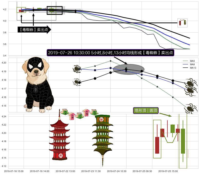 | 5 🅚:三只乌鸦 ➕ 🎢:【毒蜘蛛】卖出点均线组合卖出点信号形成后,猜想三条均线周期内的交易者都看空后市,持续下跌 ☞ 看空信号 ⇥ 【均线】交织【🅚线】⇥ 综合量化分数: 45 | > |