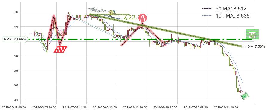 2019-07-09: 第一阻力位4.23有效抑制了下跌浪,成功阻止了价格的继续下跌。