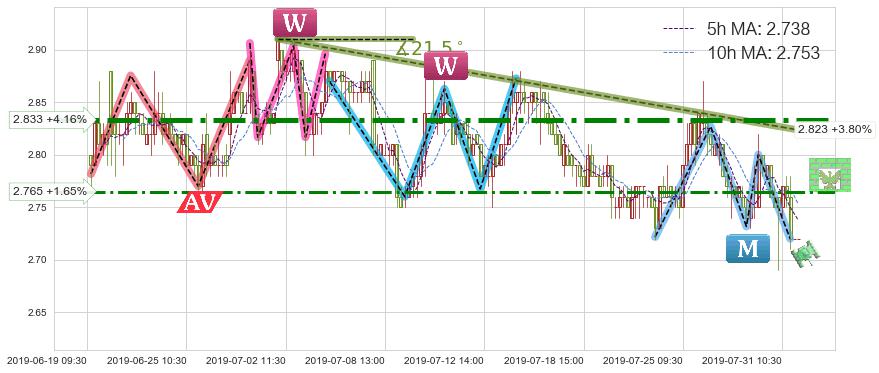 ♘ 阻力价格位2.765,可信任强度62.88%,距离最后交易2019-07-31 15:00形成的收盘价格2.720相差 +1.65%