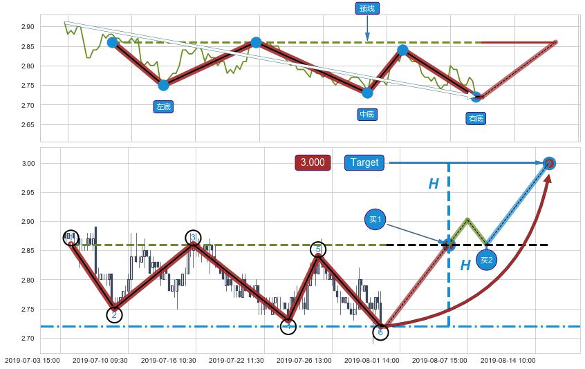 ➢ 最小反转涨幅→𝐇: 0.140000 (三重底波谷低点到两个波峰连线的垂直距离)