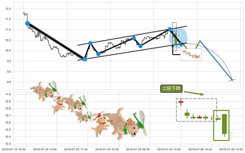 从2019-07-12 09:30至2019-07-31 15:00,共包含84个小时,阶段股价下跌-3.10%,阶段股价变动位移路程比: 1 : 9