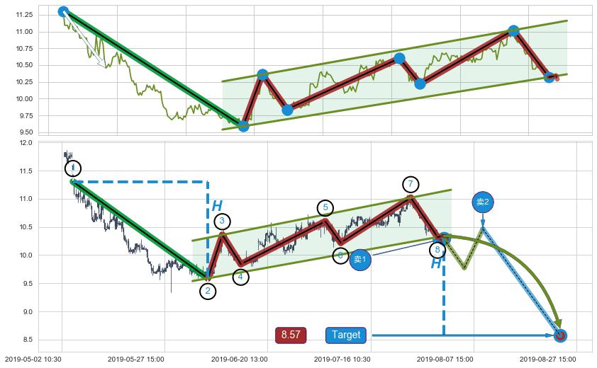 ➢ 【仅预测突破】最后价格:10.34与预测突破价格:10.29→【空间临近】后续最小【整理】第一目标价格→(08-27:15: 8.57 )