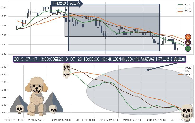 形态多维评估: ⚀ 2019-07-17 14:00:00-小时至2019-07-29 13:00:00-小时显现 10小时-20小时-30小时均线 【死亡谷】卖出点 看空信号,后市看跌,卖出