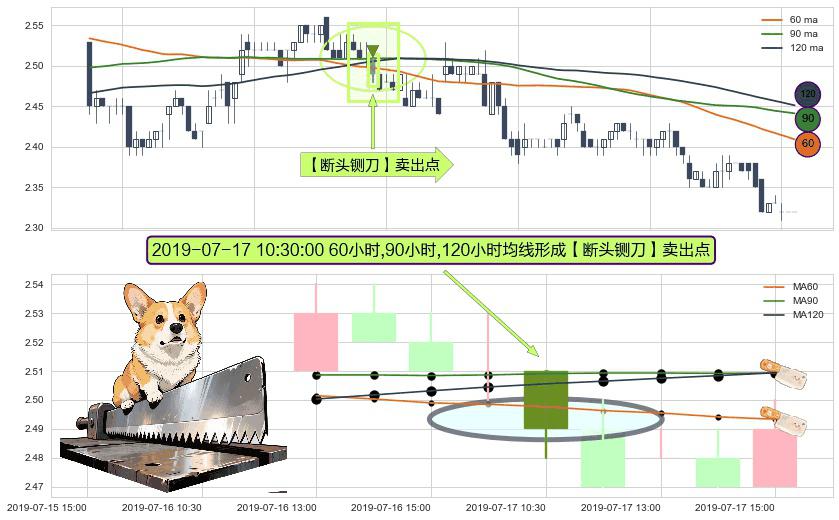 形态多维评估: ⚀ 2019-07-17 10:30:00小时显现 60小时-90小时-120小时均线 【断头铡刀】卖出点 看空信号,后市看跌,卖出