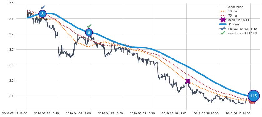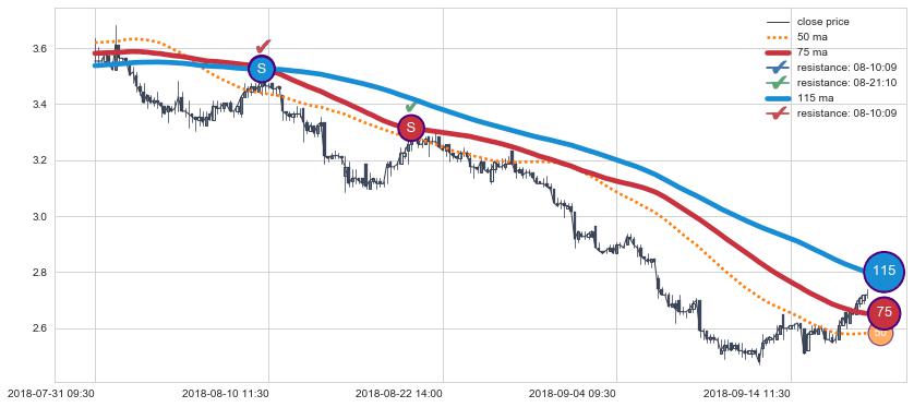 下跌趋势05-23 13:00-07-17 10:30,均线115, 75确认关键阻力2处
