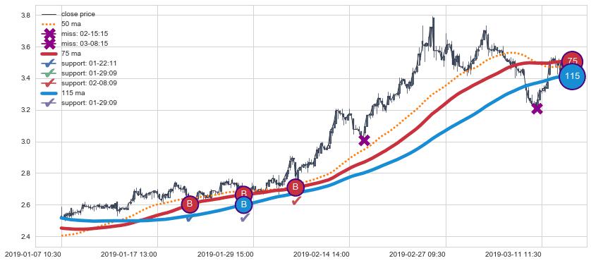 上涨趋势01-07 10:30-03-13 09:30,均线115, 75确认关键支撑3处