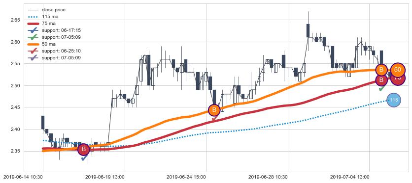 上涨趋势06-14 10:30-07-05 11:30,均线50, 75确认关键支撑3处