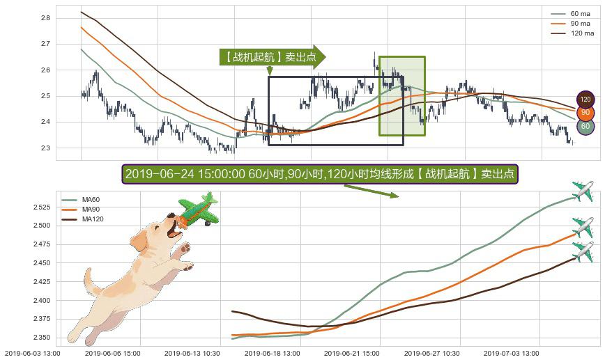 形态多维评估: ⚀ 2019-06-13 14:00:00小时-2019-07-05 09:30:00小时显现 60小时-90小时-120小时均线 【战机起航】卖出点 看空信号,后市看跌,卖出