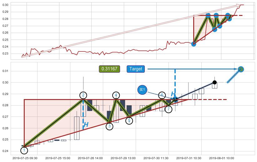 ➣ 【已确认突破】上升三角形整理 起点:07-24:14,突破点:07-30:13,形态共24交易小时