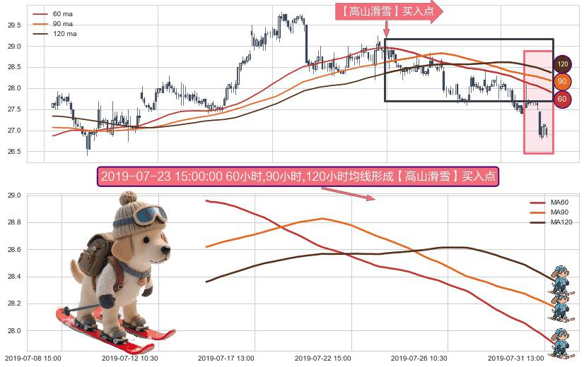 形态多维评估: ⚀ 2019-07-15 15:00:00小时-2019-07-31 15:00:00小时显现 60小时-90小时-120小时均线 【高山滑雪】买入点 看多信号,后市看涨,买入