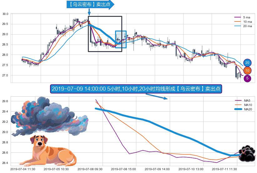 形态多维评估: ⚀ 2019-07-05 15:00:00小时-2019-07-11 13:00:00小时显现 5小时-10小时-20小时均线 【乌云密布】卖出点 看空信号,后市看跌,卖出