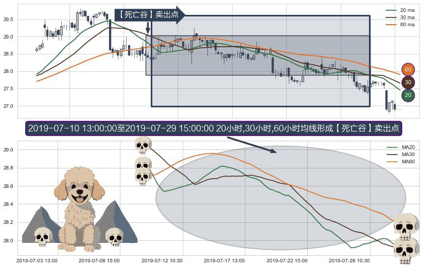 形态多维评估: ⚀ 2019-07-10 14:00:00-小时至2019-07-29 15:00:00-小时显现 20小时-30小时-60小时均线 【死亡谷】卖出点 看空信号,后市看跌,卖出