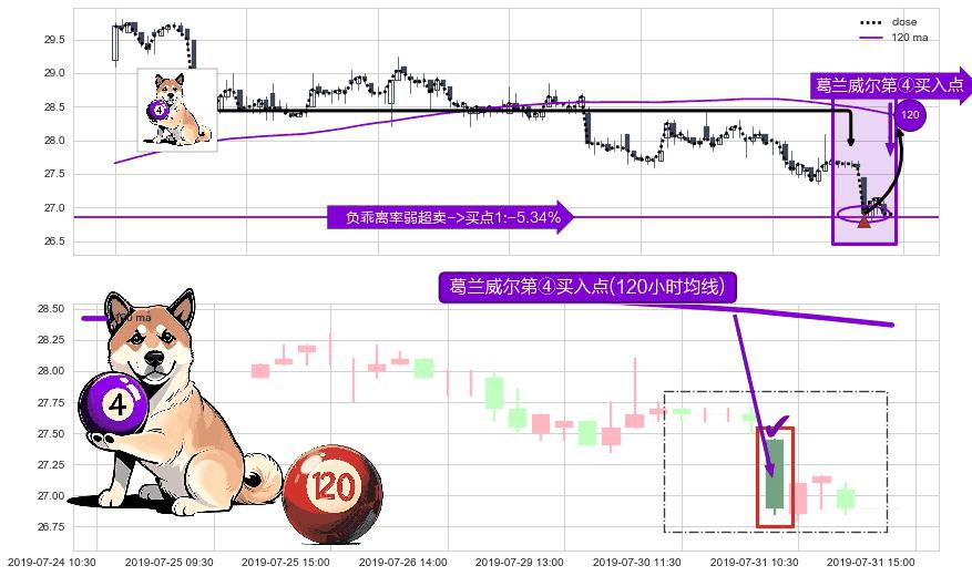 形态多维评估: ⚀ 2019-07-31 09:30:00-小时显现 葛兰威尔均线 120小时均线 第④买入点 下降趋势均值回复的短线反弹信号,后市看涨,买进信号