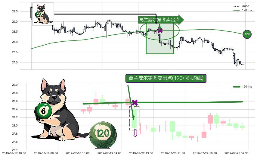 形态多维评估: ⚀ 2019-07-22 09:30:00-小时显现 葛兰威尔均线 120小时均线 第⑥卖出点 走势反转见顶信号,后市看跌,卖出信号