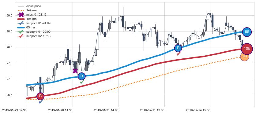 上涨趋势01-23 09:30-02-19 10:30,均线65, 105确认关键支撑3处