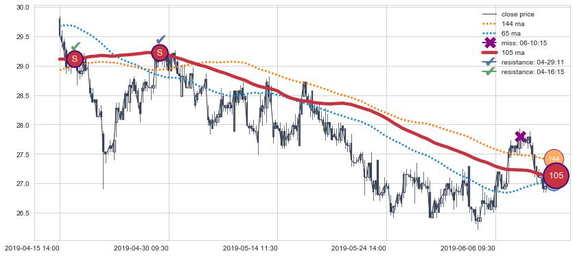 下跌趋势04-15 14:00-06-12 15:00,均线105确认关键阻力2处