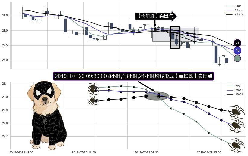 形态多维评估: ⚀ 2019-07-29 09:30:00小时显现 8小时-13小时-21小时均线 【毒蜘蛛】卖出点 看空信号,后市看跌,卖出