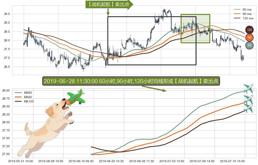 形态多维评估: ⚀ 2019-06-13 14:00:00小时-2019-07-15 15:00:00小时显现 60小时-90小时-120小时均线 【战机起航】卖出点 看空信号,后市看跌,卖出