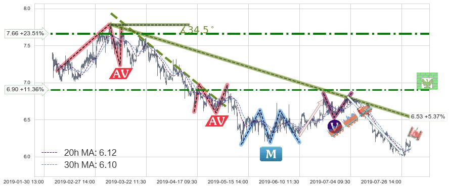 ♘ 阻力价格位6.90,可信任强度63.71%,距离最后交易2019-07-31 15:00形成的收盘价格6.20相差 +11.36%