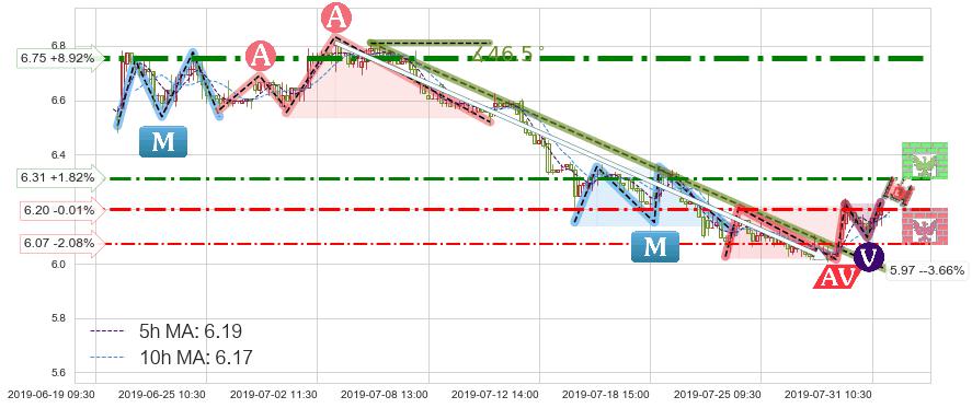 ⚔️ 2019-07-04 11:30-2019-07-30 09:30下跌趋势存在反转上涨[机会],其原下跌趋势的阻力位(5.97)已被突破[强支撑信号],原下跌趋势角度: 46.5˚