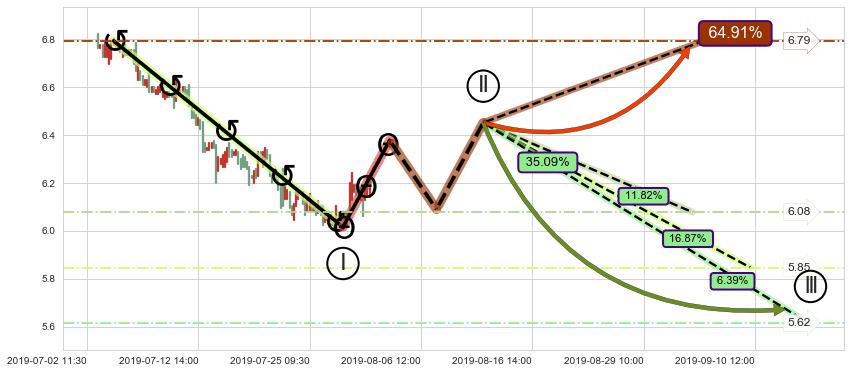 ♘ 阻力价格位6.75,可信任强度96.38%,距离最后交易2019-07-31 15:00形成的收盘价格6.20相差 +8.92%
