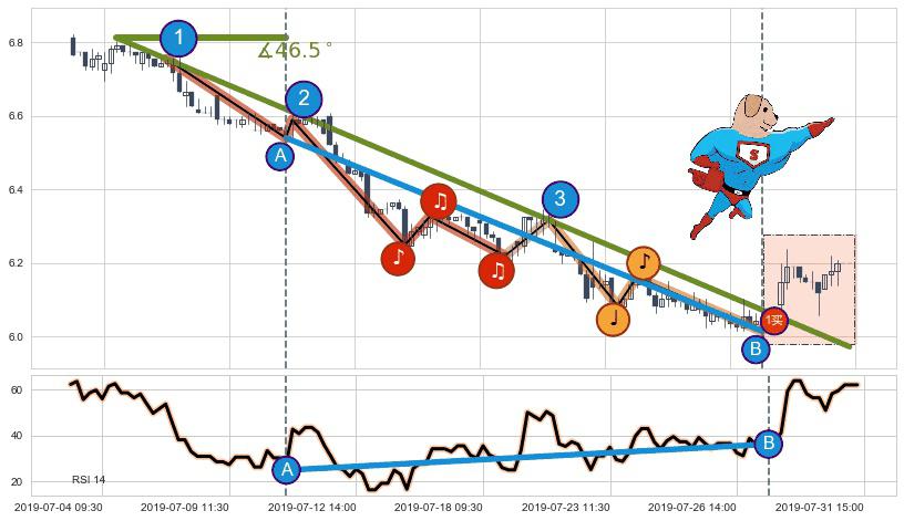 ➢ 最后的下跌趋势2019-07-04 11:30至2019-07-30 09:30:存在突破迹象,后续小反弹或者反转上涨