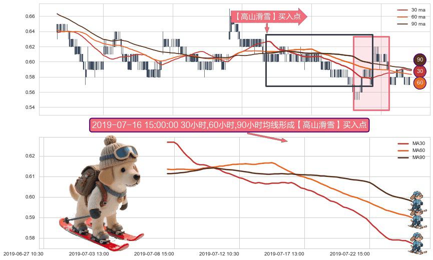 ⚀ 2019-07-08 13:00:00小时-2019-07-25 09:30:00小时显现 30小时-60小时-90小时均线 【高山滑雪】买入点 看多信号,后市看涨,买入