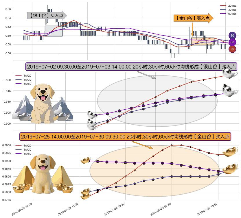 ⚃ 2019-07-25 15:00:00-小时至2019-07-30 09:30:00-小时显现 20小时-30小时-60小时均线 【金山谷】买入点 其再次确认了买入信号,可靠性更强,买入