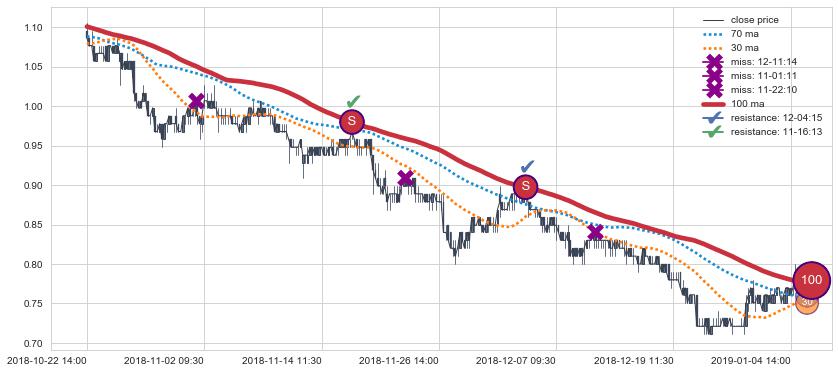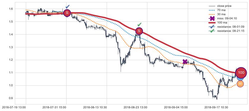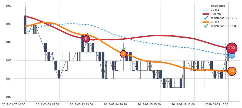 ⚅ 卖点向下突破均线后,价格走势有持续向下的迹象,但动能稍显不足,迟迟不能远离均线