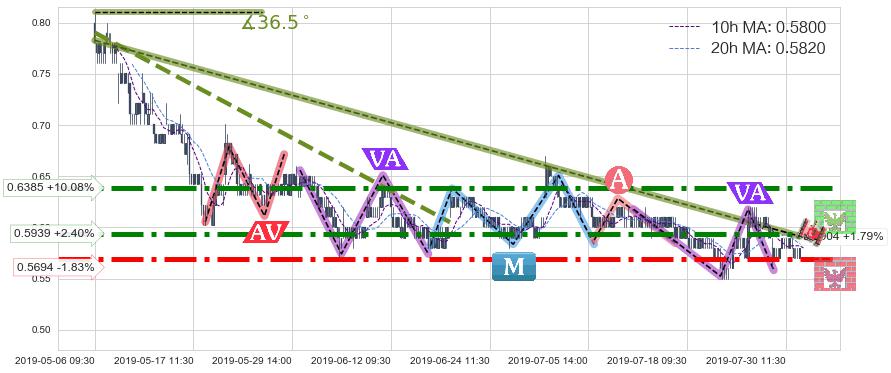 🦴 长线均值回复组合短线趋势跟踪[强阻力信号]2019-05-06 09:30-2019-07-25 09:30下跌趋势依然成立(下跌趋势跟踪依然存在),短线价格略微上行反弹(均值回复猜想),即将接近下跌趋势提供的未破位阻力价格:0.5904。