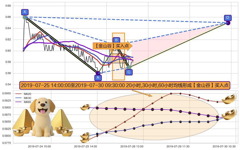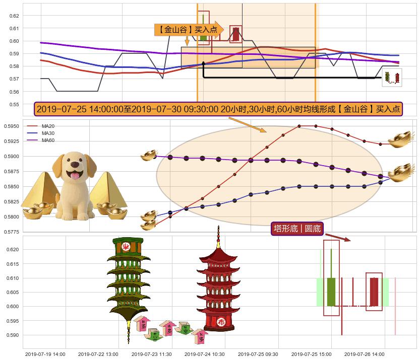 从2019-07-08 10:30至2019-07-11 11:30,共包含20个小时,阶段股价上涨0.14%,阶段股价变动位移路程比: 1 : 121