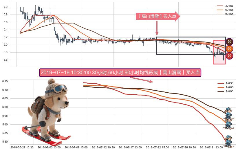 形态多维评估: ⚀ 2019-07-08 11:30:00小时-2019-07-31 15:00:00小时显现 30小时-60小时-90小时均线 【高山滑雪】买入点 看多信号,后市看涨,买入