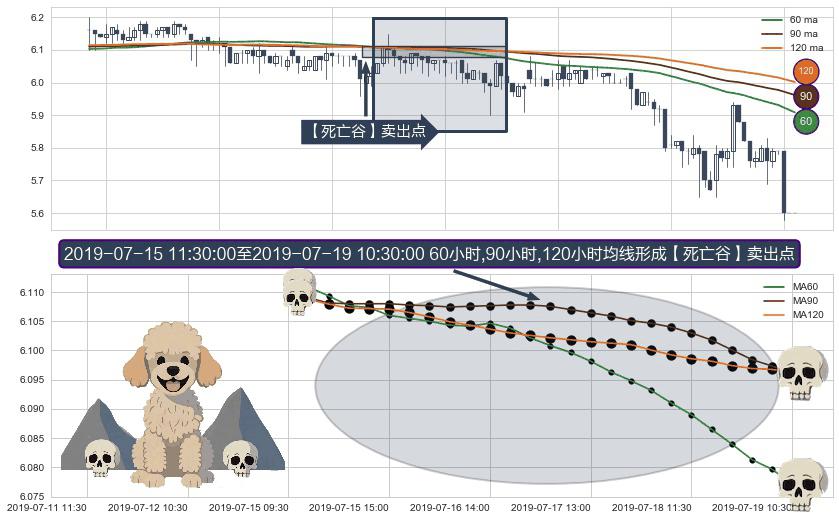 形态多维评估: ⚀ 2019-07-15 13:00:00-小时至2019-07-19 10:30:00-小时显现 60小时-90小时-120小时均线 【死亡谷】卖出点 看空信号,后市看跌,卖出