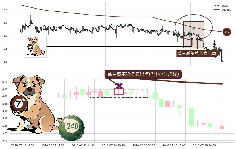 形态多维评估: ⚀ 2019-07-24 09:30:00-小时显现 葛兰威尔均线 240小时均线 第⑦卖出点 下降趋势的中继信号,后市看跌,卖出信号