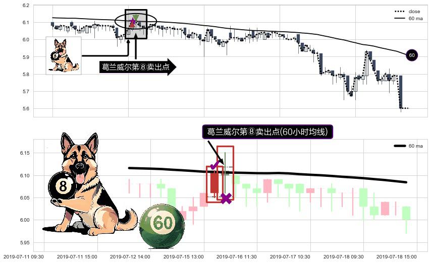 形态多维评估: ⚀ 2019-07-15 15:00:00-小时显现 葛兰威尔均线 60小时均线 第⑧卖出点 下降趋势的中继信号,后市看跌,卖出信号