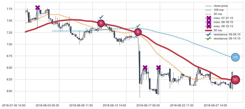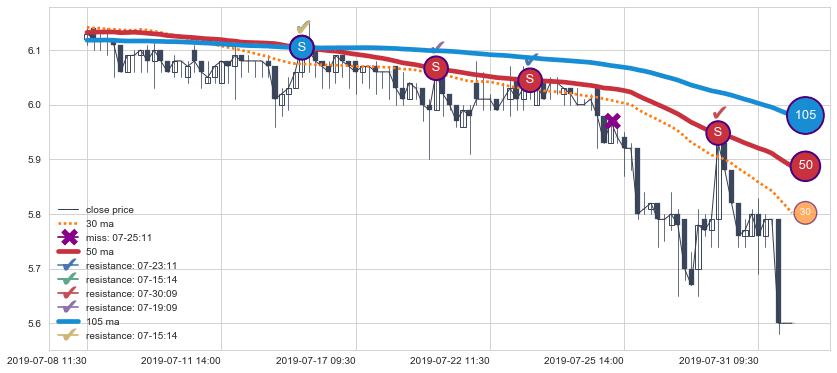 下跌趋势07-08 11:30-07-31 15:00,均线105, 50确认关键阻力4处