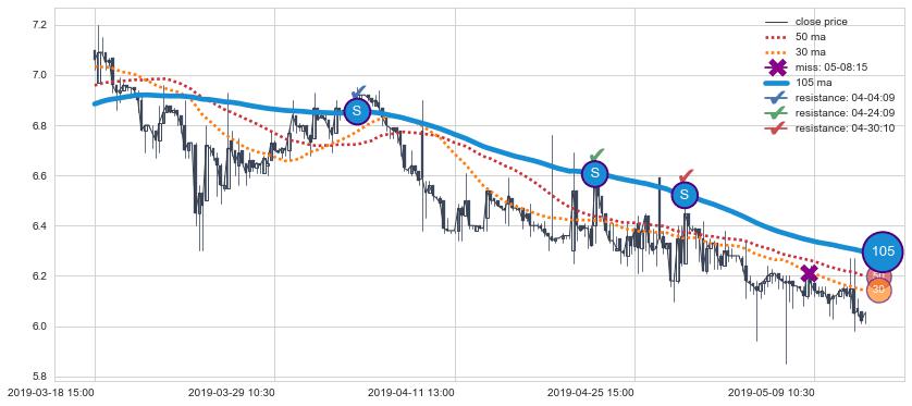 下跌趋势03-18 15:00-05-14 13:00,均线105确认关键阻力3处