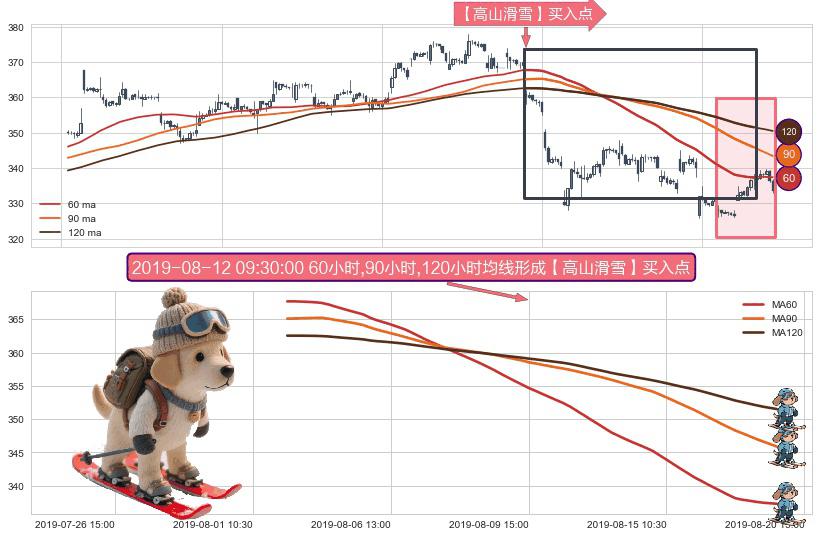 形态多维评估: ⚀ 2019-08-02 09:30:00小时-2019-08-19 15:00:00小时显现 60小时-90小时-120小时均线 【高山滑雪】买入点 看多信号,后市看涨,买入