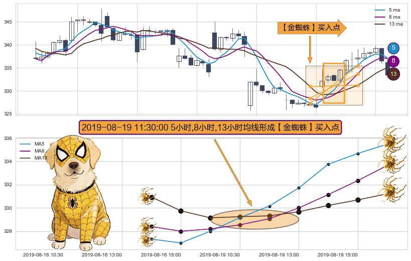 形态多维评估: ⚀ 2019-08-19 11:30:00小时显现 5小时-8小时-13小时均线 【金蜘蛛】买入点 看多信号,后市看涨,买入