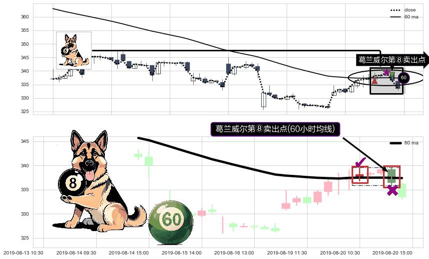 形态多维评估: ⚀ 2019-08-20 14:00:00-小时显现 葛兰威尔均线 60小时均线 第⑧卖出点 下降趋势的中继信号,后市看跌,卖出信号